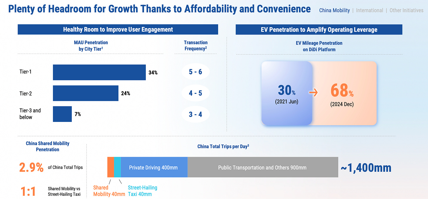 There’s still significant room for growth in lower-tier cities. IR told me that even in mature markets such as Beijing and Shanghai, they’re still seeing 6–7% year-over-year growth in trip volume, while second-tier cities are growing around 10%, and lower-tier cities even faster, as they continue to gain market share from traditional taxis. Compared with international peers like Uber and Lyft, DiDi’s share of total trips remains much smaller, leaving ample space for expansion.